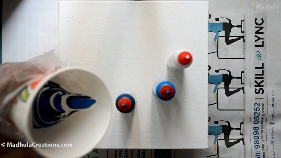 Once you’ve decided on a technique (it’s time to pour)! Take your mixed colors and pour them onto the canvas (or surface) you’ve prepared. If you’re using the flip cup method, remember to lift the cup straight up: this allows the paint to flow out evenly. However, be cautious (because) too much pressure can disrupt the process, although it may seem easy at first.